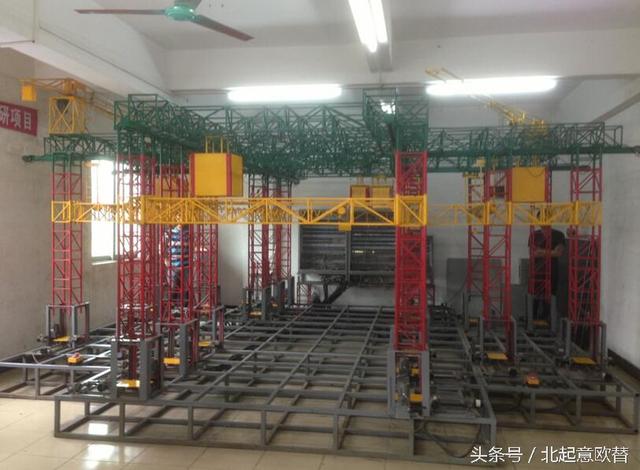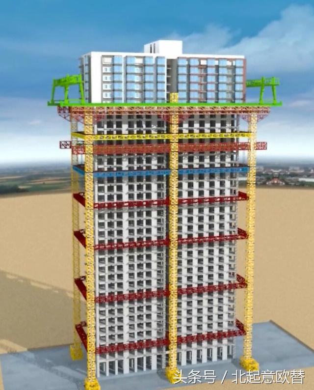 “空中造樓機”模擬一座現(xiàn)代化移動造樓工廠,應用濕租模式(設備與專業(yè)管理團隊整體租賃),在項目施工現(xiàn)場,沿建筑高度方向,集中逐層用機械操作、程序控制手段,完成主體結構現(xiàn)澆與外墻保溫飾面一體化板材同步施工的裝配式建造。內(nèi)裝工序與主體建造相隔四層穿插進行,故稱“空中造樓機”。