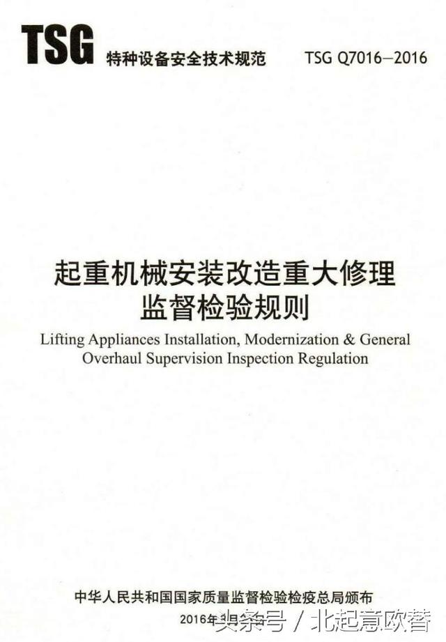 2008年8月7日,國家質(zhì)量監(jiān)督檢驗檢疫總局(以下簡稱國家質(zhì)檢總局)批準頒布《起重機械安裝改造重大維修監(jiān)督檢驗規(guī)則》(TSG Q7016-2008),2009年4月1日實施。