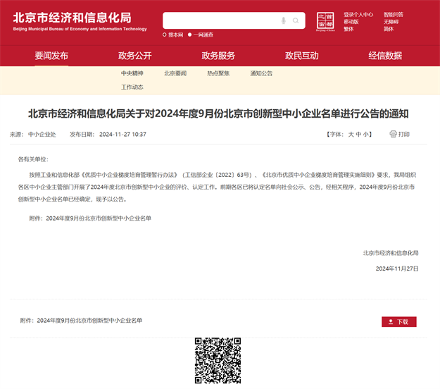 根據《北京市經濟和信息化局關于對2024年度9月份北京市創新型中小企業名單進行公告的通知》(2024年11月27日),按照工業和信息化部《優質中小企業梯度培育管理暫行辦法》(工信部企業〔2022〕63號)、《北京市優質中小企業梯度培育管理實施細則》要求,2024年度9月份北京市創新型中小企業名單已經確定,現予以公告。