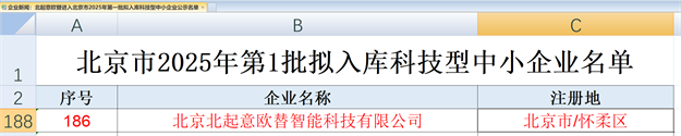 根據(jù)《科技型中小企業(yè)評(píng)價(jià)辦法》《科技型中小企業(yè)評(píng)價(jià)服務(wù)工作指引》和《工業(yè)和信息化部中小企業(yè)局關(guān)于開(kāi)展2025年度科技型中小企業(yè)評(píng)價(jià)工作的通知》有關(guān)規(guī)定。北京北起意歐替智能科技有限公司進(jìn)入北京市2025年第一批擬入庫(kù)科技型中小企業(yè)公示名單。